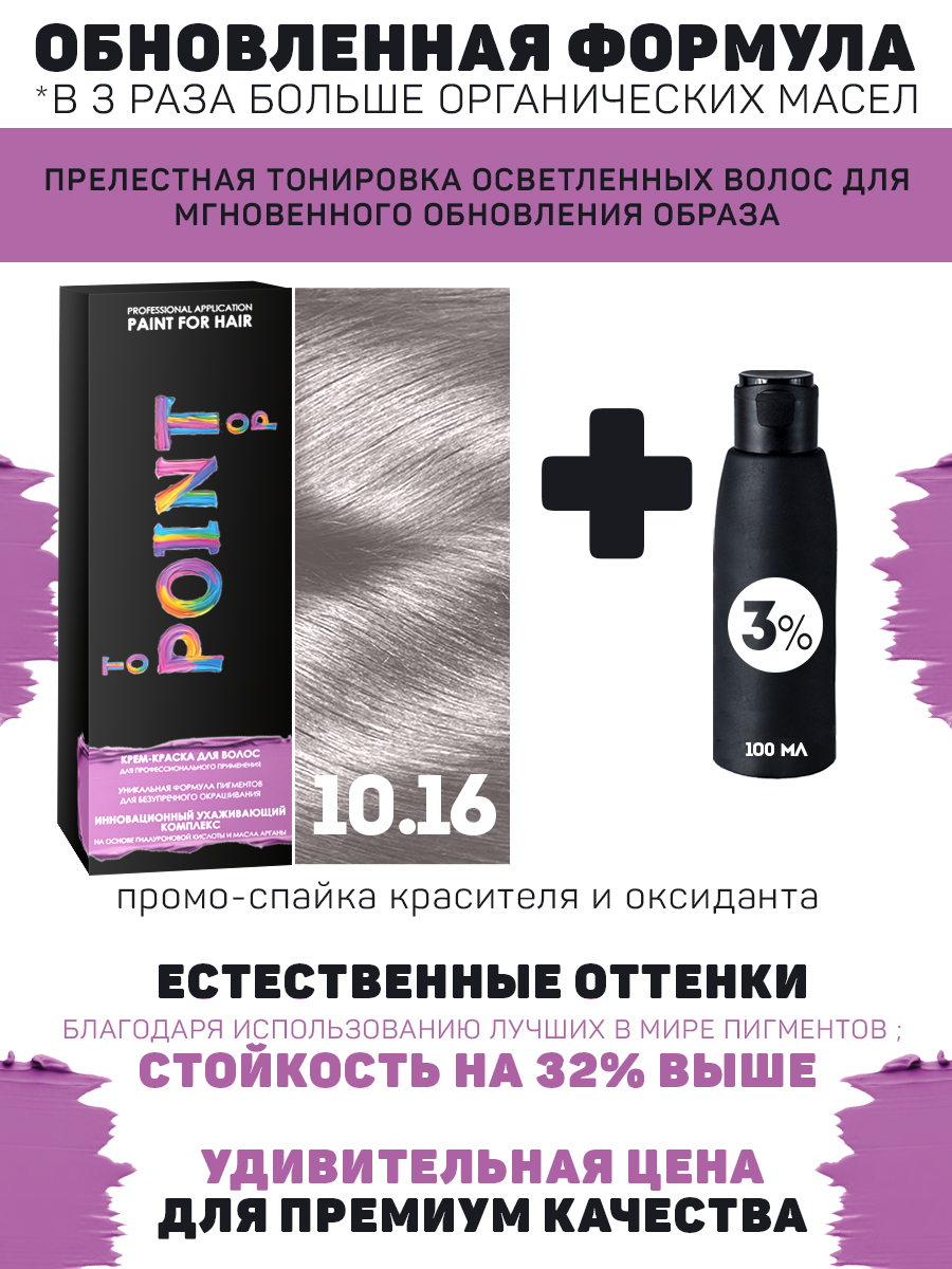 Крем-краска POINT, это 15 лет лабораторного и производственного совершенствования формул, подбора лучших пигментов и базовых масел. Результат - это уникальный продукт экстра-класса, на основе гиалуроновой кислоты, масла арганы (Марокко), в сочетании с красящим пигментом мирового лидера Lowenstein (США), произведённая на инновационном оборудовании. В сравнительных ""слепых"" тестах Мастеров колористов, краска не уступаем ведущим Европейским и США аналогам, значительно превосходя по всем базовым показателям, РФ конкурентов.