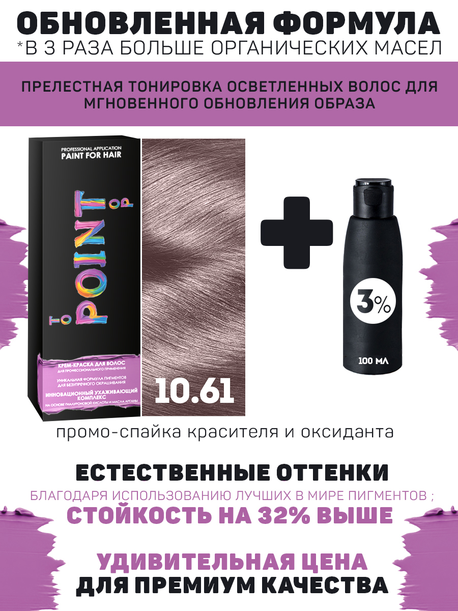 Крем-краска POINT, это 15 лет лабораторного и производственного совершенствования формул, подбора лучших пигментов и базовых масел. Результат - это уникальный продукт экстра-класса, на основе гиалуроновой кислоты, масла арганы (Марокко), в сочетании с красящим пигментом мирового лидера Lowenstein (США), произведённая на инновационном оборудовании. В сравнительных ""слепых"" тестах Мастеров колористов, краска не уступаем ведущим Европейским и США аналогам, значительно превосходя по всем базовым показателям, РФ конкурентов.