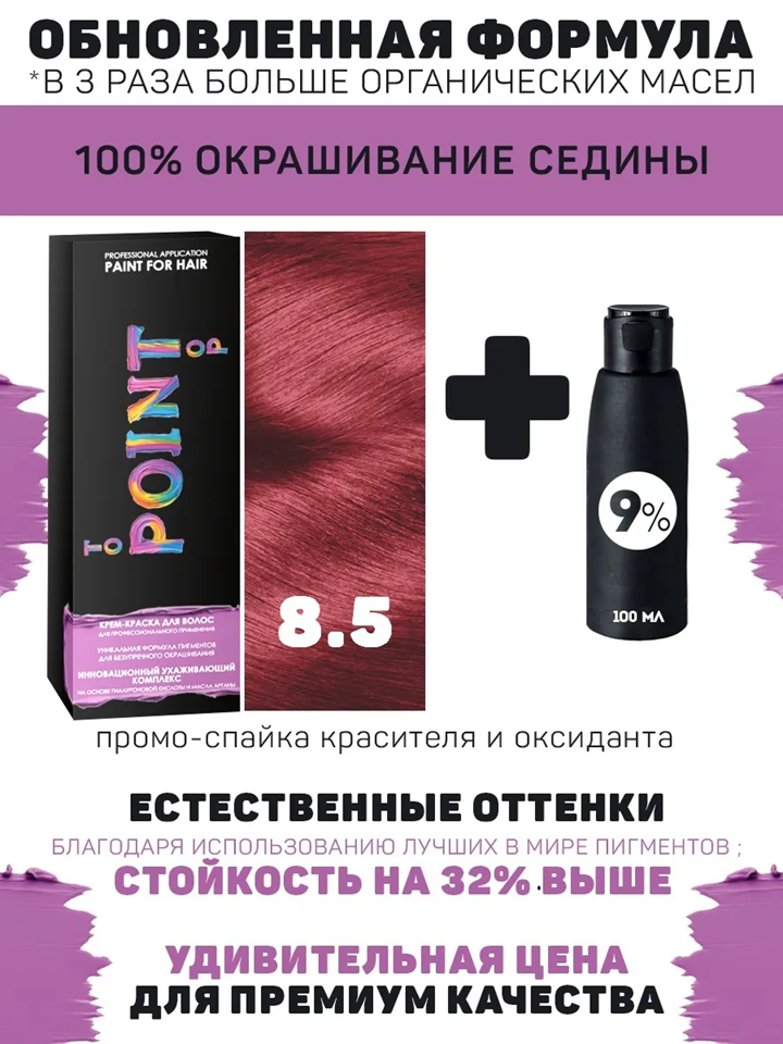 Промонабор, оксид 9% 100мл в подарок! Обязательно прочитайте информацию о товаре: Крем-краска для волос, тон 8.5 - артикул 38661116, Крем-окислитель 9% - артикул 38661598. Оксидант, предлагаемый в комплекте, является рекомендованным к данному тону, но в зависимости от оттенка волос, может Вам НЕ подходить! Внимательно прочитайте инструкцию, предлагаемую в описании к соответствующему красителю. В целом: Оксид 3% (арт. 38661574) в соотношении 1к1 для тонировки осветленных волос; Оксид 6% (арт. 38661581) в соотношении 1к1 для окрашивания более светлых волос или тон в тон; Оксид 9% в соотношении 1к1 для окрашивания на 1-2 тона более темных волос. Доскональное соблюдение инструкции - залог успеха.