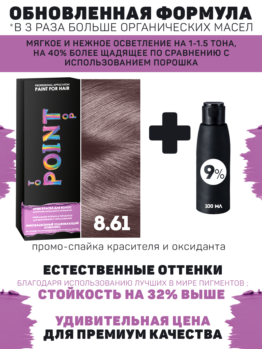 ТОН №8.61 ПРЕДНАЗНАЧЕН ДЛЯ ИСПОЛЬЗОВАНИЯ МАСТЕРАМИ со 100% успеха. На наш взгляд ОПЫТНЫМ потребителем дома, вероятность успеха 50%. Крем-краска POINT. - 17 лет лабораторного и производственного совершенствования формул, подбора лучших пигментов и базовых масел. Результат - это уникальный продукт экстра-класса, на основе гиалуроновой кислоты, масла арганы (Марокко), в сочетании с красящим пигментом мирового лидера Lowenstein (США), произведённая на инновационном оборудовании. В сравнительных "слепых" тестах Мастеров колористов, краска не уступаем ведущим Европейским и США аналогам, значительно превосходя по всем базовым показателям РФ конкурентов. Рекомендации ниже, это прогноз химических реакций, НО Мастерами может применяться иначе. Время окр.40-50мин. СТОП: При СТЕКЛОВИДНОЙ седине может быть не эффект. База: нейтральная , либо с желтизной 8-10УГТ Оксидант:POINT 6%. 1к1. При базе 7УГТ 9% оксидант 1к1. При нанесении на осветлённые волосы 3% 1к1.